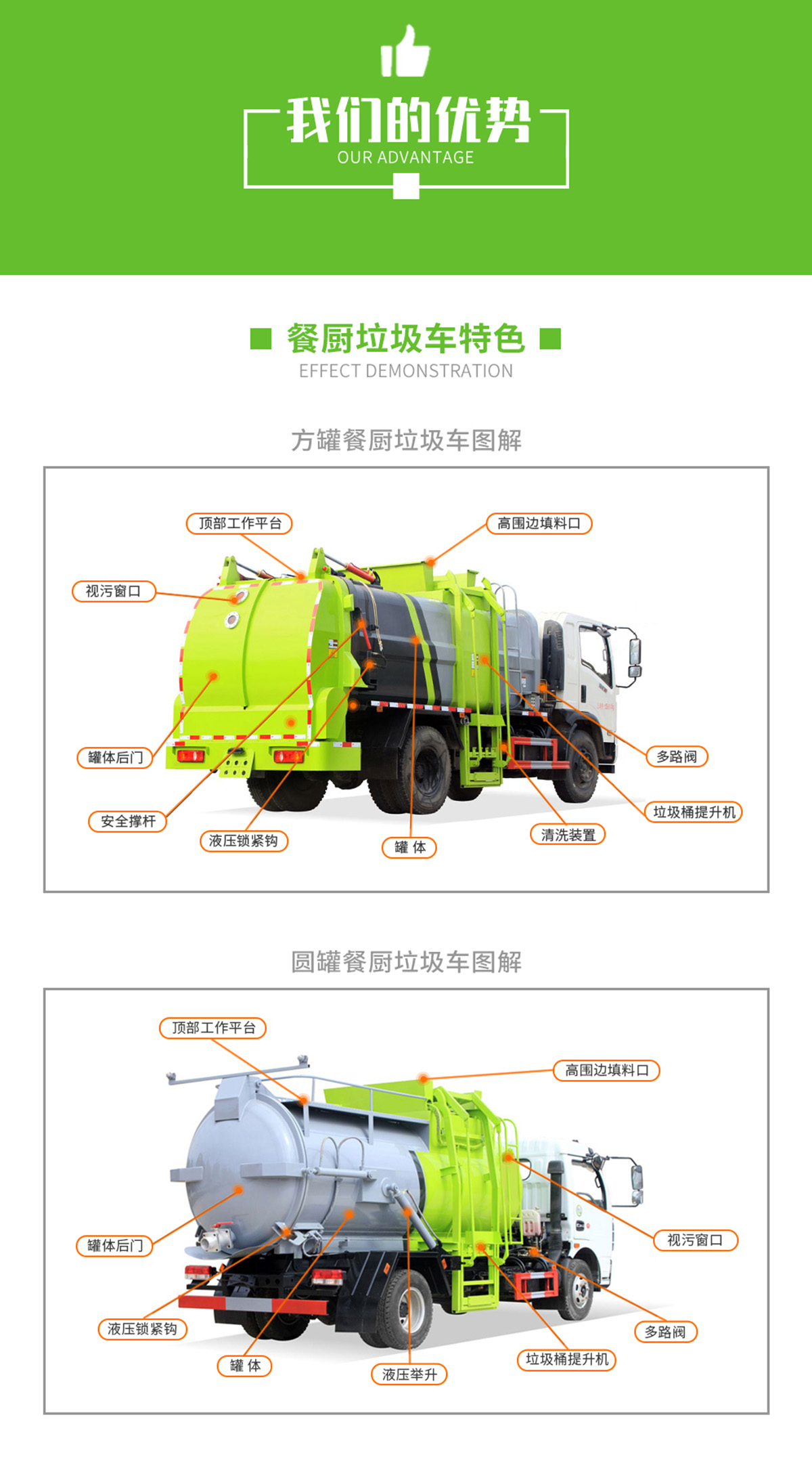 東風8方餐廚垃圾車又稱廚余垃圾車、余廚垃圾車、餐廚垃圾收集車、泔水車等,是垃圾車的一種,主要用于收集和運輸生活垃圾,食品垃圾(泔水)及城市淤泥的專用車輛。可配裝載不同規格的標準垃圾桶,廣泛應用在賓館、飯店、食堂、學校等單位的餐廚泔水處理。具有裝、卸垃圾自動化程度高、工作可靠、密封性好、裝載容積大、操作簡便、作業過程密閉,無污水泄露和異味的散發,環保性好等特點。