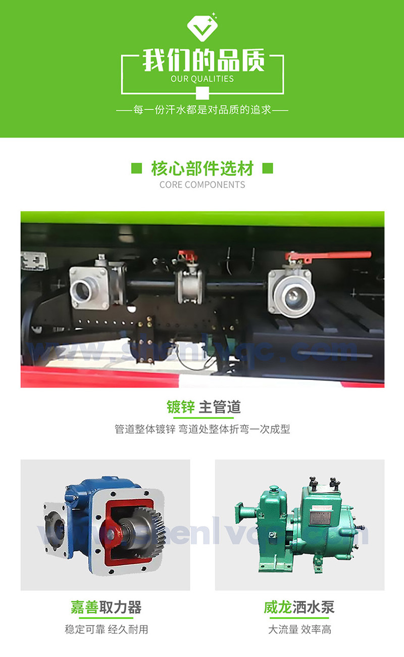 前沖、后灑、側噴、后平臺高炮、自流閥、消防接頭、濾網、噴頭、帶自吸自排、全功率取力器、音樂喇叭
